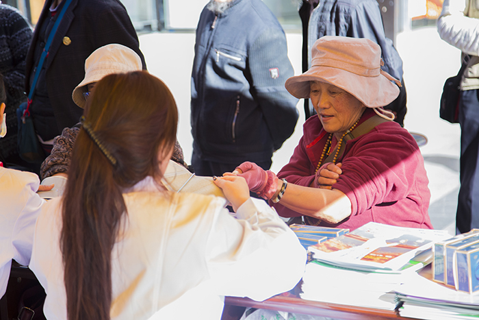 自14日早上九點(diǎn)活動(dòng)開始,前來阜康醫(yī)藥義診宣傳點(diǎn)測血壓、測血糖、咨詢身體健康問題及安全用藥知識(shí)的人便絡(luò)繹不絕,整整一上午,阜康醫(yī)藥16名醫(yī)護(hù)人員都在一刻不停的忙前忙后,但能夠?yàn)閺V大藏族同胞及社會(huì)群眾服務(wù),大家都絲毫不覺得辛苦,反而發(fā)自內(nèi)心的感到充實(shí)與喜悅。據(jù)活動(dòng)結(jié)束后統(tǒng)計(jì),本次活動(dòng)西藏阜康醫(yī)藥發(fā)展有限公司免費(fèi)發(fā)放各類相關(guān)資料千余份,免費(fèi)發(fā)放維生素、鈣片、風(fēng)濕及心腦類等藥品一萬兩千余元,免費(fèi)測血壓、血糖、看病等也多達(dá)數(shù)百人次。