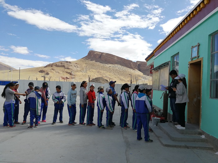 我跟隨劉冬梅醫(yī)生組前往革吉縣初級(jí)中學(xué)進(jìn)行篩查工作,學(xué)生們?cè)诎嘀魅蔚膸ьI(lǐng)下,排著整齊的隊(duì)伍,填寫資料、做B超、抽血留樣,秩序井然。