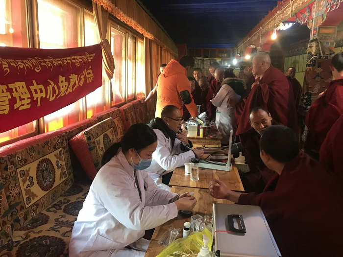 11月28日上午,西藏阜康醫(yī)院慢病管理中心義診分隊(duì)來(lái)到甘丹寺管理委員會(huì)。在文物資產(chǎn)處處長(zhǎng)羅布次仁的接待下,我院5名醫(yī)務(wù)人員走進(jìn)了甘丹寺,義診分隊(duì)此行帶著阜康人送醫(yī)送藥的暖心活動(dòng)、帶著“用知識(shí)和良知為人類健康服務(wù)”的宗旨、帶著阜康醫(yī)院幾千元的藥品,為全寺430名僧侶免費(fèi)測(cè)血壓、血糖、氧飽和度以及發(fā)放常見(jiàn)疾病的藥物。