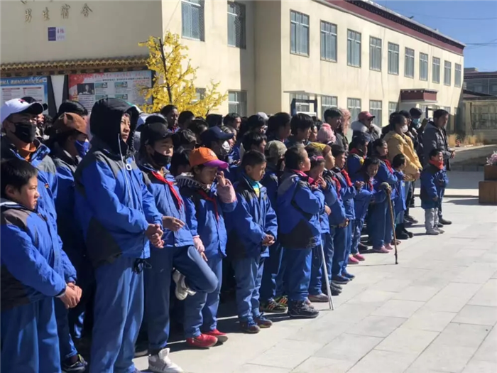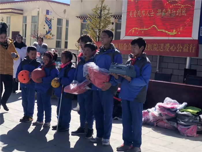 11月1日上午,西藏阜康天使基金會吉拉女士受西藏阜康醫(yī)療股份有限公司黨委書記、阜康天使基金會會長王斌先生,西藏阜康醫(yī)療股份有限公司總經(jīng)理、阜康天使基金會秘書長劉瀟瀟女士委托與西藏阜康醫(yī)院義診隊(duì)一起,攜價值一萬五千元的藥品和兩萬元的物資來到那曲市特殊教育學(xué)校,為這里的孩子們帶來了文化體育學(xué)習(xí)用品及藥品等物資。在特校校長次仁拉姆的組織下,特校師生列隊(duì)歡迎我們的到來,還精心準(zhǔn)備了錦旗和潔白的哈達(dá)。