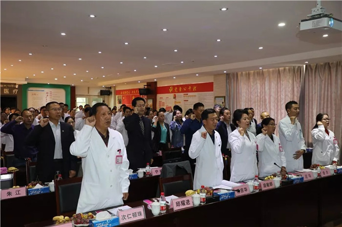 慶?;顒釉谙挛?5點準時進行。西藏阜康醫(yī)院醫(yī)務(wù)科主任田鵬帶領(lǐng)與會醫(yī)師代表宣讀“希波克拉底誓言”,西藏阜康醫(yī)院婦產(chǎn)兒童院區(qū)(院區(qū)三)劉連福院長致辭。