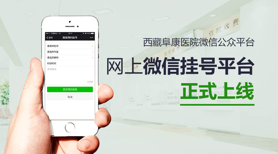 昨日,記者從西藏阜康醫(yī)院獲得好消息:5月24日,西藏阜康醫(yī)院微信公眾平臺網(wǎng)上預(yù)約掛號系統(tǒng)正式上線,可提供微信掛號、在線問診、健康咨詢、新聞動態(tài)等服務(wù)。