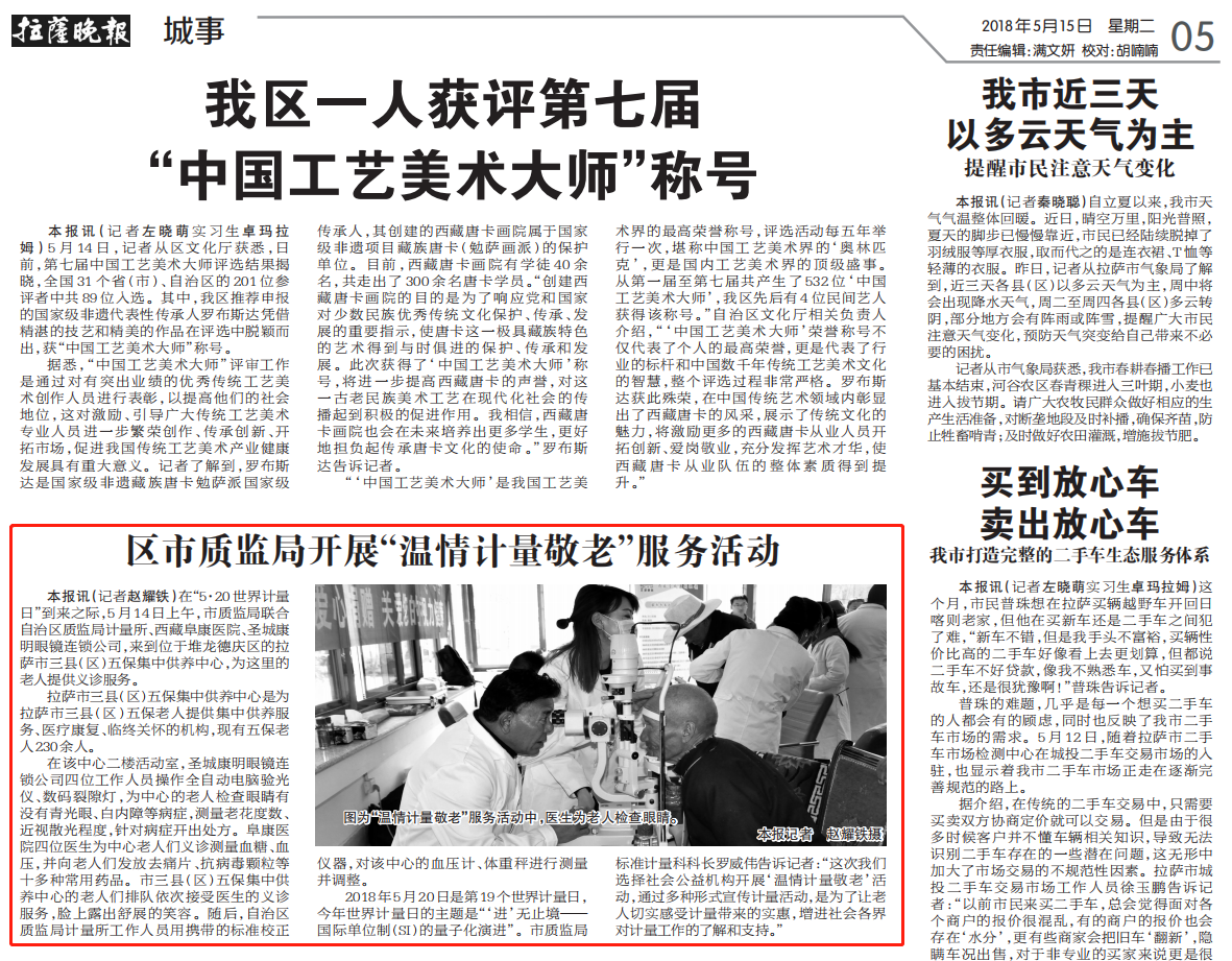 本報訊(記者趙耀鐵)在“5·20世界計(jì)量日”到來之際,5月14日上午,市質(zhì)監(jiān)局聯(lián)合自治區(qū)質(zhì)監(jiān)局計(jì)量所、西藏阜康醫(yī)院、圣城康明眼鏡連鎖公司,來到位于堆龍德慶區(qū)的拉薩市三縣(區(qū))五保集中供養(yǎng)中心,為這里的老人提供義診服務(wù)。