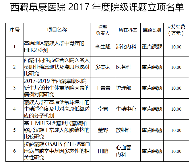 這是我院首次組織申報并批準(zhǔn)立項的院級課題。課題主持人均為我院醫(yī)務(wù)人員。本年度立項資助的6個課題均為院級重點(diǎn)課題,每項課題將提供10萬元的研究經(jīng)費(fèi)。課題自2017年10月1日正式實(shí)施,期限為兩年。