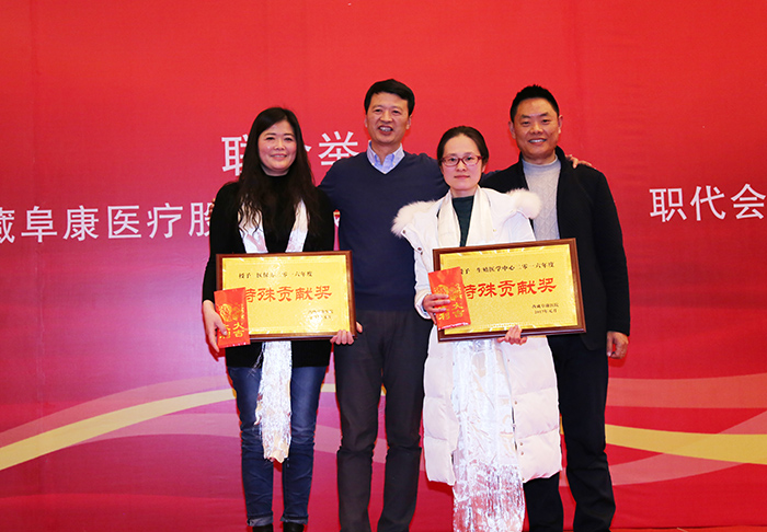 王斌董事長、劉瀟瀟總經(jīng)理等院領(lǐng)導(dǎo)為先進(jìn)科室、優(yōu)秀員工頒發(fā)獎?wù)录蔼劷?/span>